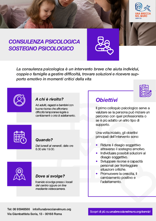 Il servizio si svolge presso i locali del centro oppure on line mediante videocamera.