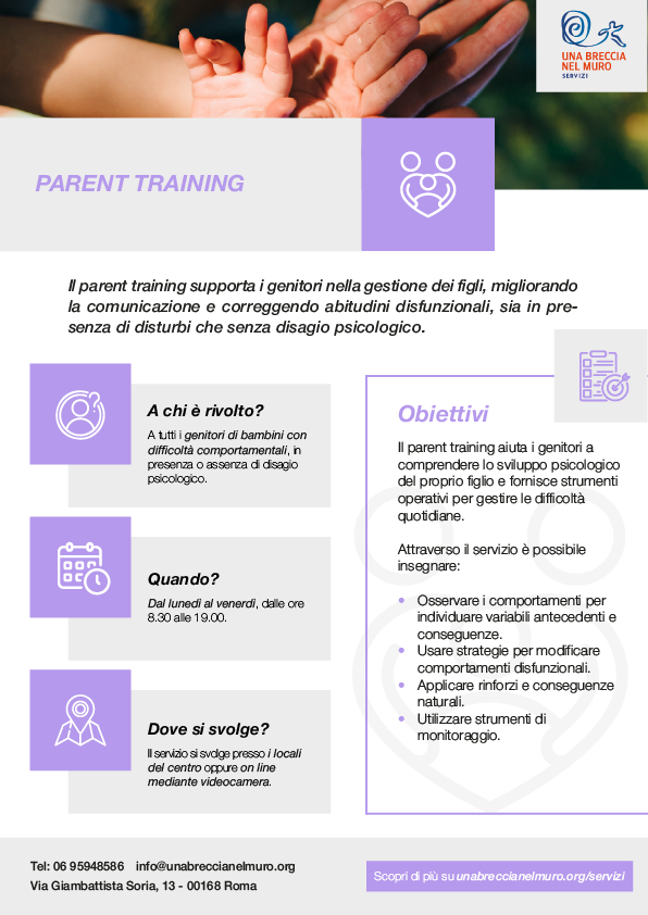 Il servizio di parent training si pone sia l’obiettivo di accrescere nella coppia genitoriale la conoscenza relativa allo sviluppo psicologico del proprio figlio, fornendo strumenti concreti ed operativi per affrontare le difficoltà quotidiane, sia quello di offrire un vero e proprio sostegno psicologico, creando uno spazio di condivisione all’interno del quale far emergere emozioni, timori, frustrazioni e speranze.